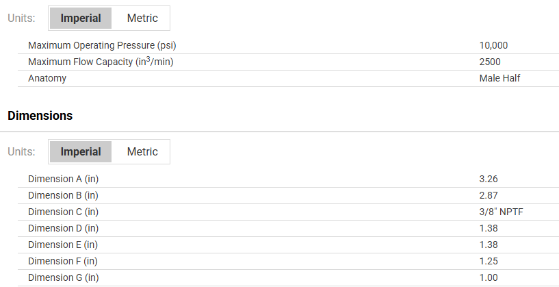 The C-Series High Flow Hydraulic Coupler is the standard used on most Enerpac pumps and cylinders up to 10,000 psi (700 bar). These 3/8" high flow couplers provide a quick and secure connections, allowing a flow up to 2100 in3/min (35 liters) per minute.